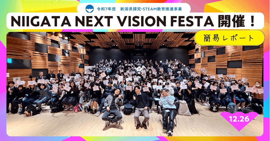 2025年12月26日、新潟県教育委員会が主催する「新潟県探究・STEAM教育推進事業 NIIGATA NEXT VISION FESTA」が開催されました。本イベントは、県内各地の高校生が一堂に会し、日頃の探究活動の成果を共有するとともに、データサイエンスやSTEAMの視点から「新潟の未来」を考える一日です。会場には生徒たちの熱気と期待感があふれ、まさに「アイデアがつながり、新潟の未来が動き出す」時間となりました。